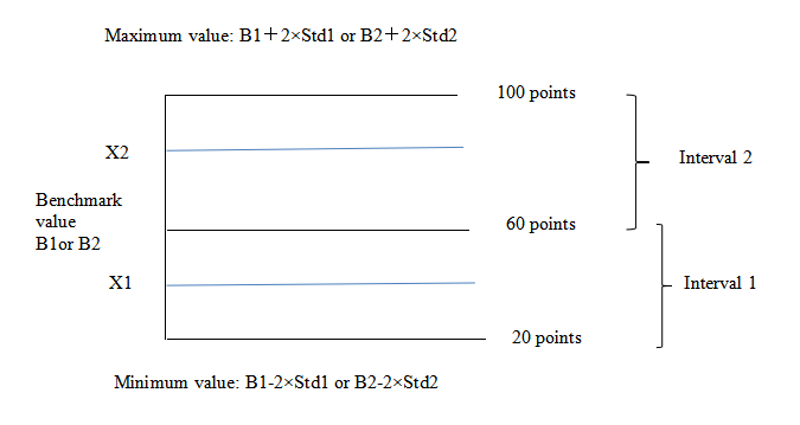 (3) If the indicator value falls into Interval 1, the score is 60-(B1-X1) / (2×Std1) × 40 (X1 stands for all indicator values that fall into Interval 1).