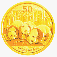 (二)1/10盎司圆形金质纪念币为普制币,含纯金1/10盎司,直径18毫米,面额50元,成色99.9%,最大发行量800000枚。