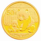(二)1/10盎司圆形金质纪念币为普制币,含纯金1/10盎司,直径18毫米,面额50元,成色99.9%,最大发行量80万枚。