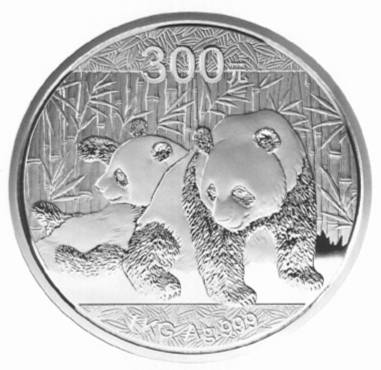 (十)1公斤圆形银质纪念币为精制币,含纯银1公斤,直径100毫米,面额300元,成色99.9%,最大发行量4000枚。