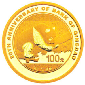 8克圆形金质纪念币背面图案为熊猫攀树图,并刊“8g Au .999”字样、“青岛银行成立20周年纪念”英文字样及面额。