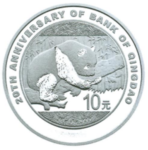 30克圆形银质纪念币背面图案为熊猫攀树图,并刊“30g Ag .999”字样、“青岛银行成立20周年纪念”英文字样及面额。