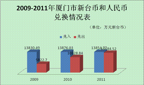 从银行交易量来看,厦门新台币和人民币兑换量逐年增长。2009年兑换量1.97亿元新台币,同比增长185.33%;2010年兑换量2.42亿元新台币,同比增长23.16%;2011年兑换量为2.70亿元新台币,同比增长11.71%。一直以来,厦门以兑入新台币为主,但近几年随着台湾地区向大陆游客开放,新台币兑出量增长迅速。