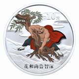 1盎司彩色银质纪念币背面图案之一为鲁智深倒拔垂杨柳造型(局部彩色),并刊“花和尚鲁智深”中文字样及面额;1盎司彩色银质纪念币背面图案之二为林冲雪夜上梁山造型(局部彩色),并刊“豹子头林冲”中文字样及面额。