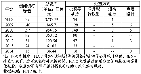 美国作为此次危机的重灾区,倒闭的银行中有大有小,其中既有资产规模高达3200亿美元的华盛顿互惠这样的大银行,也不乏许多受到危机冲击的众多小银行。对于超过90%的倒闭银行,FDIC主要通过“收购与承接”方式进行处置,运用存款保险基金去支持一家健康机构收购倒闭机构的资产,同时承接存款, FDIC对那些无法被收购的资产进行处置。对于少数资产规模较大的问题银行,FDIC的做法是建立一家过桥机构,进行短暂运营之后,再寻找一家经营良好的银行承接其资产和存款。本轮国际金融危机中,FDIC就是运用“过桥银行”的方式处置了一家比较大的银行——印地迈克银行(资产达320亿美元)。这次危机中,也有像美国银行和花旗银行这样的系统重要性银行出现问题,FDIC则会同美联储、财政部对这些银行进行在线修复,进行“经营中的银行救助”(open bank assistance)帮助他们恢复经营。