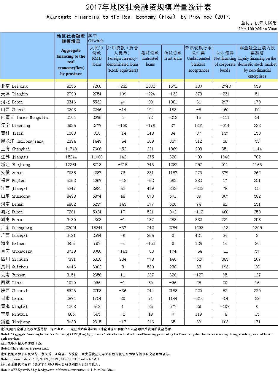 2017年地区社会融资规模增量统计表