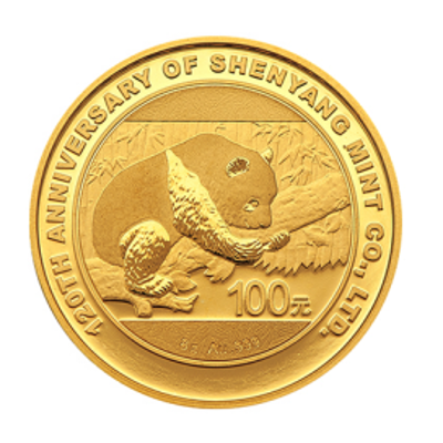8克圆形金质纪念币背面图案为熊猫攀树图,并刊“8g Au .999”字样、“沈阳造币有限公司成立120周年纪念”英文字样及面额。