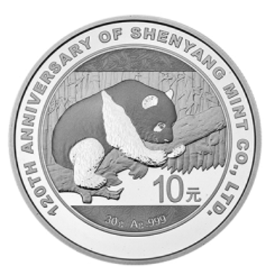 30克圆形银质纪念币背面图案为熊猫攀树图,并刊“30g Ag .999”字样、“沈阳造币有限公司成立120周年纪念”英文字样及面额。