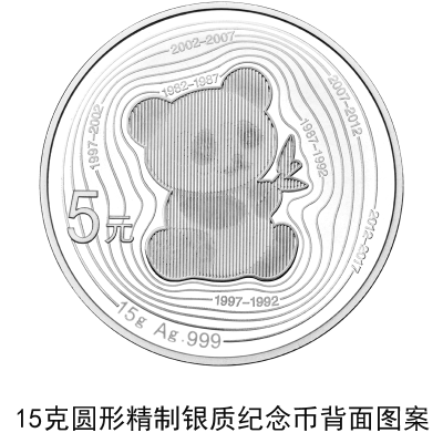 15克圆形银质纪念币背面图案为卡通大熊猫剪影图形,衬以年轮线条及年份数字组合设计,并刊“15g Ag .999”字样及面额。