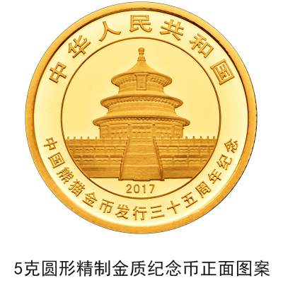 该套金银纪念币正面图案均为北京天坛祈年殿,并刊国名、年号及“中国熊猫金币发行三十五周年纪念”字样。