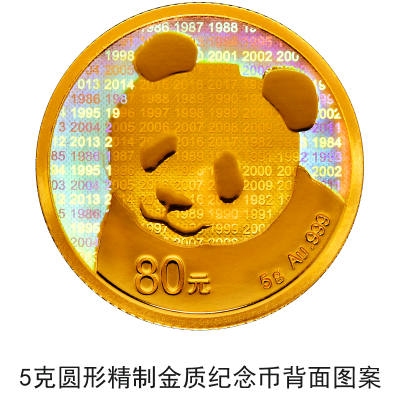 5克圆形金质纪念币背面图案为大熊猫剪影图形,衬以年份数字排列组合设计,并刊“5g Au .999”字样及面额。