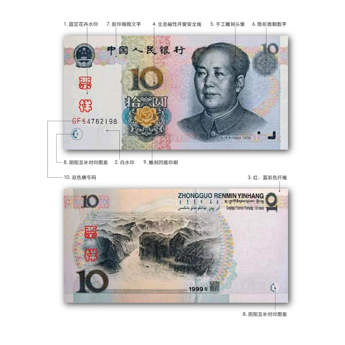 主色调为蓝黑色,票幅长140mm,宽70mm。正面主景为毛泽东头像,左侧为“中国人民银行”行名、阿拉伯数字“10”、面额“拾圆”和花卉图案,左上角为中华人民共和国国徽图案,左下角印有双色横号码,右下方为盲文面额标记。背面主景为“长江三峡”图案,右上方为“中国人民银行”汉语拼音字母和蒙、藏、维、壮四种民族文字的“中国人民银行”字样和面额。