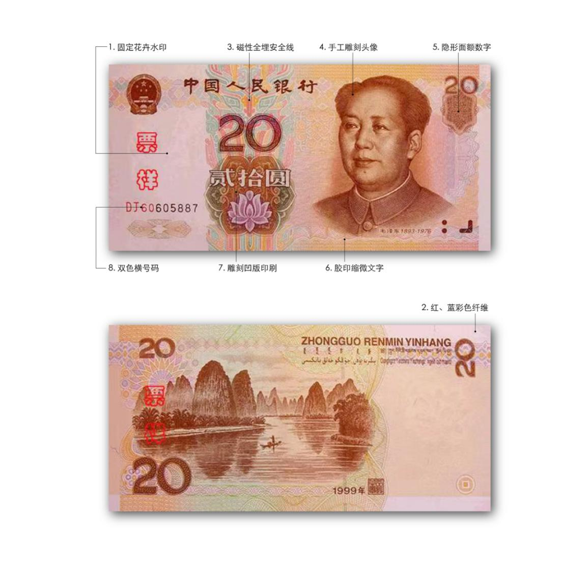 主色调为棕色,票幅长145mm,宽70mm。正面主景为毛泽东头像,左侧为“中国人民银行”行名、阿拉伯数字“20”、面额“貳拾圆”和花卉图案,左上方为中华人民共和国国徽图案,在下方印有双色横号码,右下方为盲文面额标记。背面主景为“桂林山水”图案,右上方为“中国人民银行”汉语拼音字母和蒙、藏、维、壮四种民族文字的“中国人民银行”字样和面额。