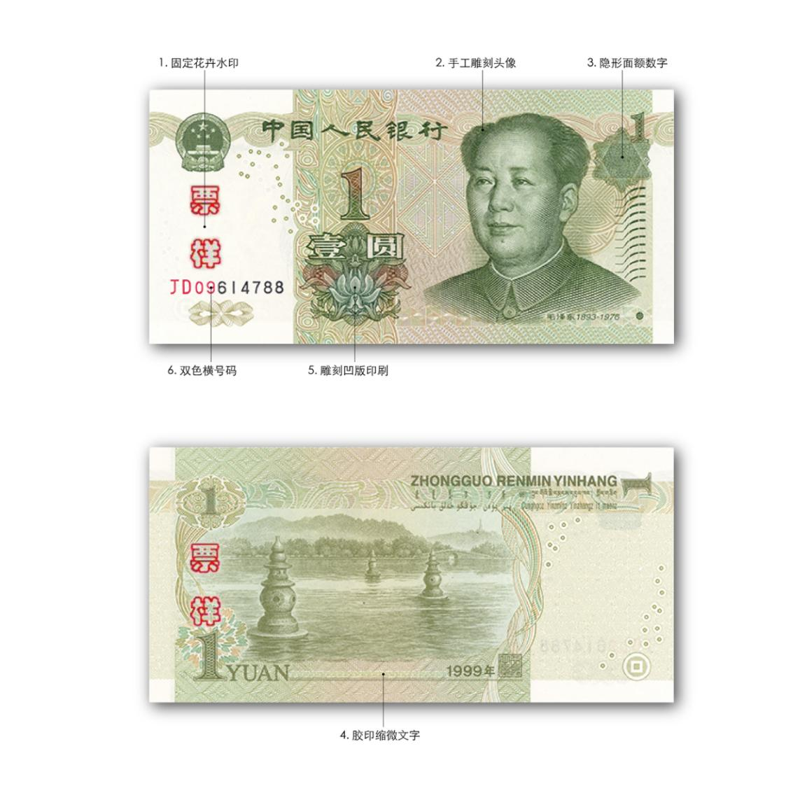 主色调为橄榄绿色,票幅长130毫米、宽63毫米。正面主景为毛泽东头像,左侧为“中国人民银行”行名、阿拉伯数字“1”、面额“壹圆”和花卉图案,左上角为中华人民共和国国徽图案,左下角印有双色横号码,右下角为盲文面额标记。背面主景为“西湖”图案,左下方印有“1YUAN”,右上方为“中国人民银行”汉语拼音字母和蒙、藏、维、壮四种民族文字的“中国人民银行”字样和面额。