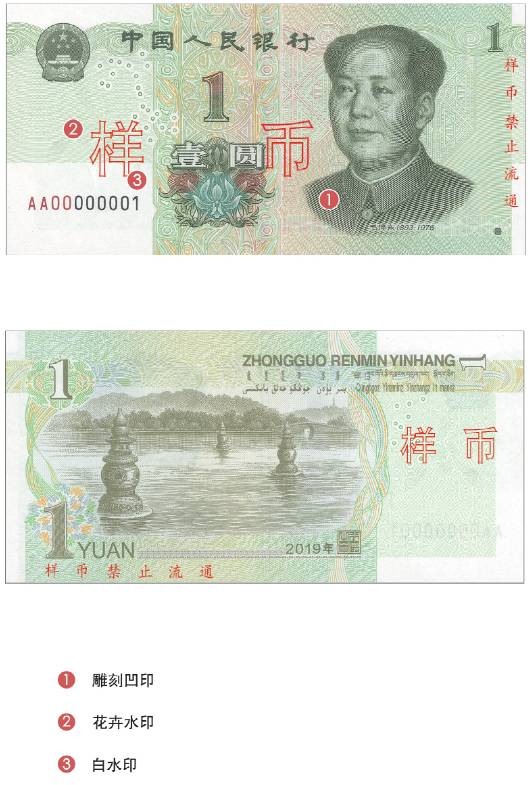 2019年版第五套人民币1元纸币规格、主图案、主色调、“中国人民银行”行名、国徽、盲文面额标记、汉语拼音行名、民族文字等要素,雕刻凹印等防伪特征,均与1999年版第五套人民币1元纸币相同。