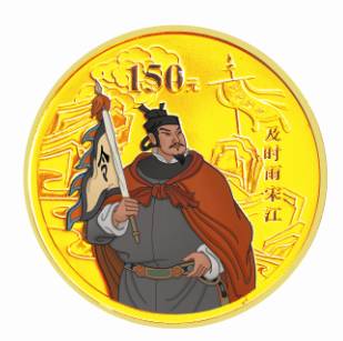 1/3盎司彩色金质纪念币背面图案为宋江人物造型(局部彩色),并刊“及时雨宋江”中文字样及面额。
