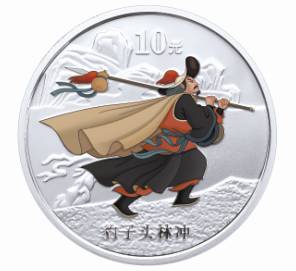 1盎司彩色银质纪念币背面图案之一为鲁智深倒拔垂杨柳造型(局部彩色),并刊“花和尚鲁智深”中文字样及面额;1盎司彩色银质纪念币背面图案之二为林冲雪夜上梁山造型(局部彩色),并刊“豹子头林冲”中文字样及面额。