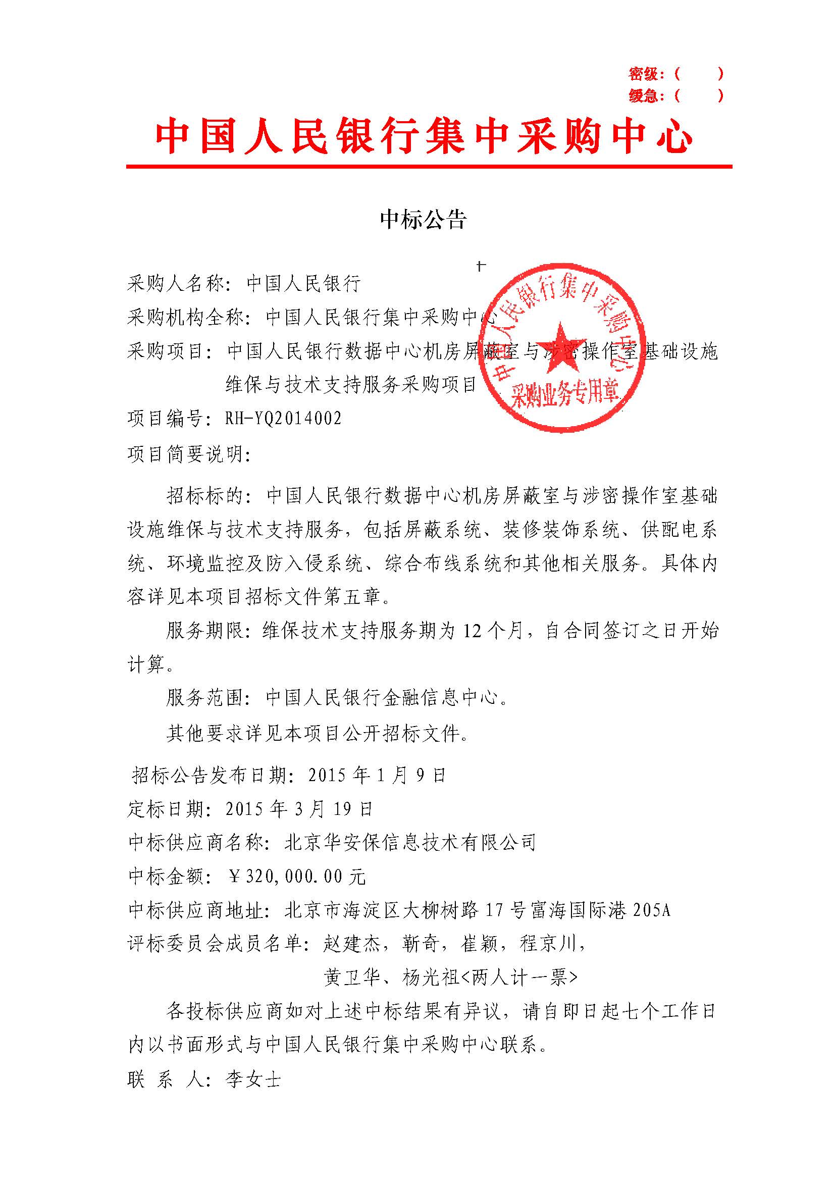 中国人民银行数据中心机房屏蔽室与涉密操作室基础设施维保与技术支持服务采购项目 RH-YQ2014002 中标公告