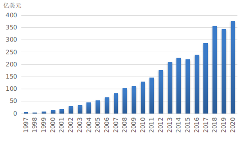图2 1997~2020年我国知识产权使用费跨境支出情况