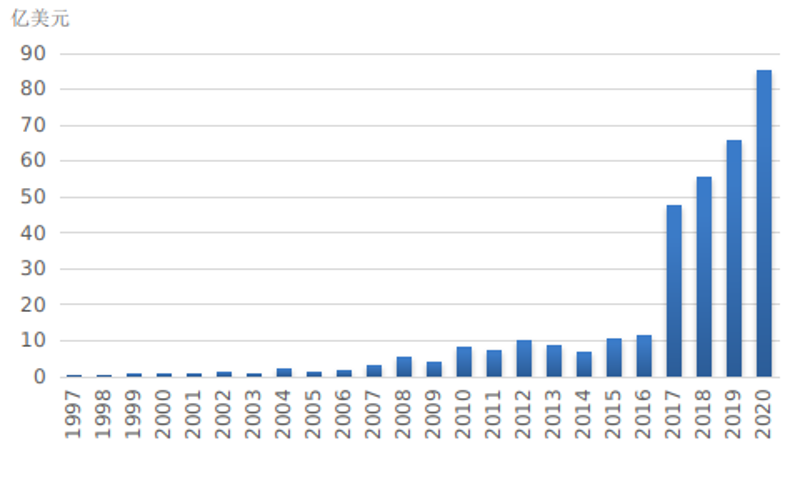 图3 1997~2020年我国知识产权使用费跨境收入情况