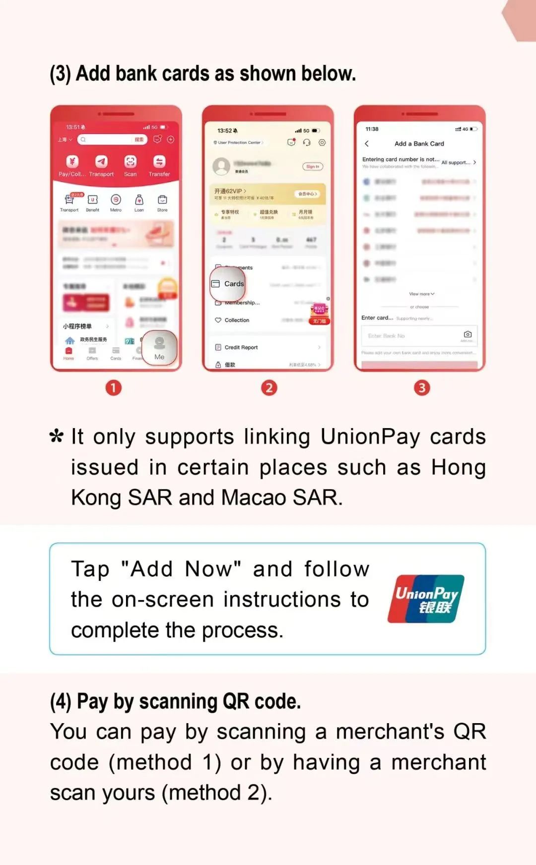 您可以使用云闪付、支付宝、微信以及部分境外电子钱包进行便捷的移动支付。快来体验吧!