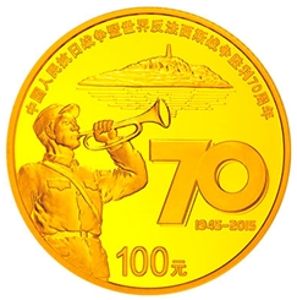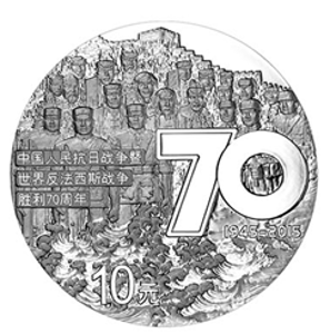 中国人民银行决定自2015年8月20日起陆续发行中国人民抗日战争暨世界反法西斯战争胜利70周年纪念币一套。该套纪念币包括金银纪念币3枚、镍包钢纪念币1枚,均为中华人民共和国法定货币。其中,金银纪念币包括7.776克(1/4盎司)金质纪念币1枚、31.104克(1盎司)银质纪念币1枚、155.52克(5盎司)银质纪念币1枚。 一、金银纪念币 (一)纪念币图案。 1.正面图案。 金银纪念币正面图案均为中华人民共和国国徽,并刊国名、年号。 2.背面图案。 7.776克(1/4盎司)圆形金质纪念币背面图案为吹响抗战号角的八路军战士形象与延安宝塔山、延河水、数字“70”与时间“1945-2015”共同组成标志性符号的组合设计,并刊“中国人民抗日战争暨世界反法西斯战争胜利70周年”字样及面额。 31.104克(1盎司)圆形银质纪念币背面图案为代表全民族抗战的人物群雕造型与长城、浪花、数字“70”与时间“1945-2015”共同组成标志性符号的组合设计,并刊“中国人民抗日战争暨世界反法西斯战争胜利70周年”字样及面额。 155.52克(5盎司)圆形银质纪念币背面图案为“V”字造型与和平鸽、数字“70”与时间“1945-2015”共同组成标志性符号的组合设计,并刊“中国人民抗日战争暨世界反法西斯战争胜利70周年”字样及面额。 (二)纪念币规格和发行量。 1.7.776克(1/4盎司)圆形金质纪念币为精制币,含纯金7.776克(1/4盎司),直径22毫米,面额100元,成色99.9%,最大发行量50000枚。 2.31.104克(1盎司)圆形银质纪念币为精制币,含纯银31.104克(1盎司),直径40毫米,面额10元,成色99.9%,最大发行量100000枚。 3.155.52克(5盎司)圆形银质纪念币为精制币,含纯银155.52克(5盎司),直径70毫米,面额50元,成色99.9%,最大发行量5000枚。 (三)金银纪念币由深圳国宝造币有限公司、沈阳造币有限公司和上海造币有限公司铸造,中国金币总公司总经销。 二、镍包钢纪念币 (一)纪念币图案。 1.正面图案。 正面图案为中华人民共和国国徽,内缘上方刊“中华人民共和国”国名,下方刊年号“2015”。 2.背面图案。 背面图案为数字“70”与时间“1945-2015”共同组成的标志性符号,其上方为五只和平鸽由远及近展翅飞翔,衬景为以长城图案展现胜利的“V”字。内缘上方刊“中国人民抗日战争暨世界反法西斯战争胜利70周年”字样,右下方刊面额“1元”。 (二)纪念币面额、规格、材质和发行数量。 镍包钢纪念币面额1元,直径25毫米,材质为镍包钢,发行数量为5亿枚。 (三)镍包钢纪念币与现行流通人民币职能相同,与同面额人民币等值流通。 中国人民银行 2015年8月18日 中国人民抗日战争暨世界反法西斯战争 胜利70周年金银纪念币图案
