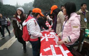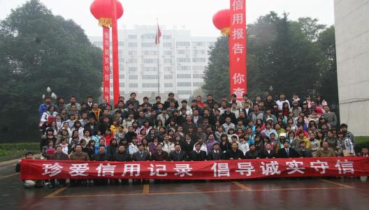四川师大学术厅外举办了大型征信金融知识宣传和签名活动,现场千余师生在“珍爱信用记录、倡导诚实守信”大型横幅上签名,庄严写下自己的诚信承诺。活动结束后,参加仪式的全体人员一起在横幅前合影留念。此次“百讲千传”征信知识竞赛在大学校园内开展,历时2月,参与学生超过5万人,获得巨大成功。这也是人行成都分行与四川省教育厅08年选聘百名宣讲员和千名宣传员,在全省大学校园内开展“百讲千传”征信宣传机制的后续活动。我分行将继续做好高校征信知识宣传长效机制建设,加强对大学生的诚信教育,引导大学生重承诺、讲信用,并培养他们正确应用现代金融手段做好人生职业规划,逐步探索出适合四川实际的征信和金融知识国民教育方法。